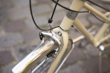 La potence réglable en hauteur est associée à un guidon recourbé vers l’arrière en aluminium légèrement relevé. Il contribue à la position semi droite si confortable et naturelle. Les mains viennent se poser sur des poignées en cuir enroulé délicieusement rétro.